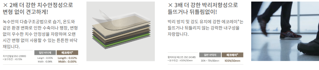 에코레이+는 박리 방지 및 강도 유지에 강해 들뜨거나 뒤틀리지 않는 강력한 내구성을 자랑합니다.