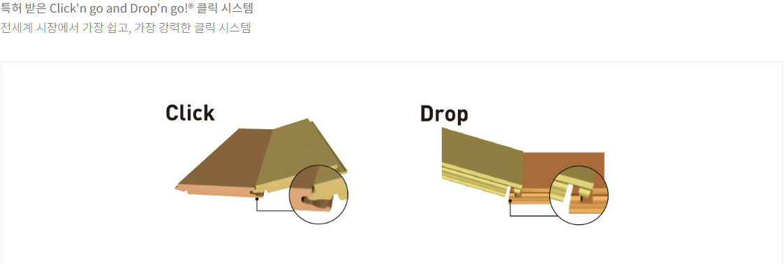 에코클릭+은 총 두께 5mm, 상지 두께 0.33mm, 0.55mm로 구성된 녹수의 특허 받은 클릭 LVT입니다. 특허 받은 ‘Click’n go and Drop’n go!®’ (클릭앤고 앤드 드랍앤고) 클릭 공법으로 시공이 더 쉬워졌지만, 더 강력한 결합력을 얻었습니다.