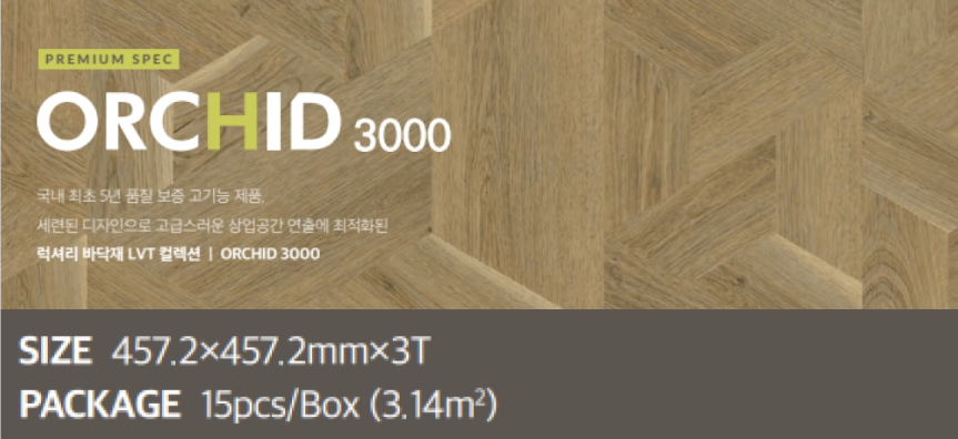 | 오키드3000 | 3.0mm | 0.3mm | 프리미엄 우드·스톤, 고급 무광 텍스처 | 고급 상업공간 |