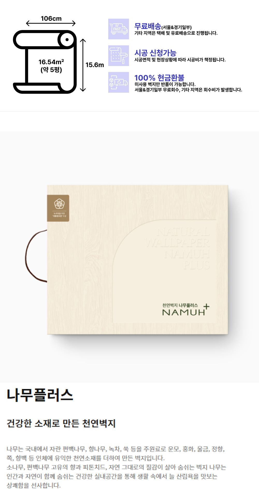 제일벽지의 고급실크벽지, 나무플러스 3001-19 입니다. 판매 단위는 롤이며, 1.06m(W)*15.6m(L) / 5평 시공이 가능합니다. 일반 소비자가 기준 115610원에 판매하고 있으며, 사업자 단가는 앱 설치 및 로그인 시 확인 가능합니다.