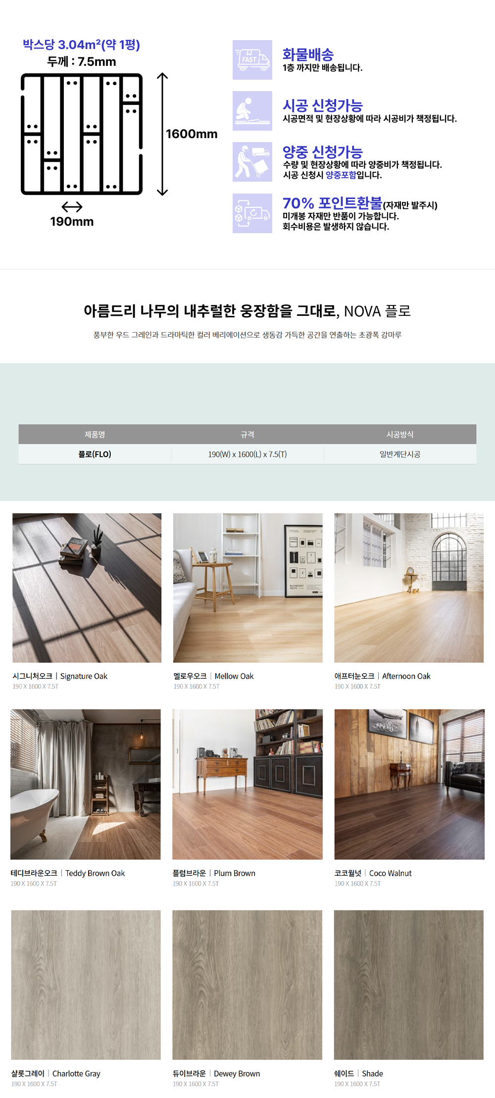 노바마루의 강마루, 플로 시그니처오크 입니다. 판매 가격 단위는 박스이며, 7.5(T)*190(W)*1600(L) (박스당 3.04㎡)입니다. 일반 소비자가 기준 95,040원에 판매하고 있으며, 사업자 단가는 앱 설치 및 로그인 시 확인 가능합니다.
