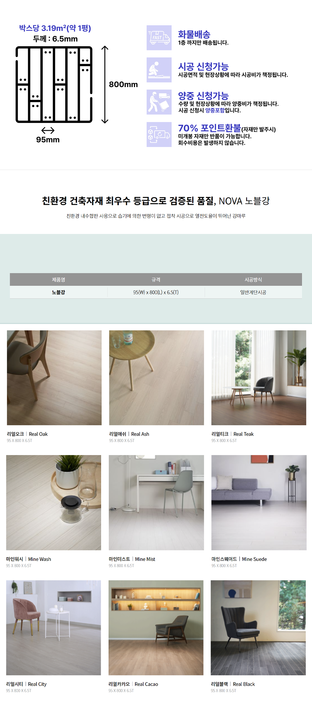 노바마루의 강마루, 노블강 리얼애쉬 입니다. 판매 가격 단위는 박스이며, 6.5(T)*95(W)*800(L) (박스당 3.19㎡)입니다. 일반 소비자가 기준 69,520원에 판매하고 있으며, 사업자 단가는 앱 설치 및 로그인 시 확인 가능합니다.