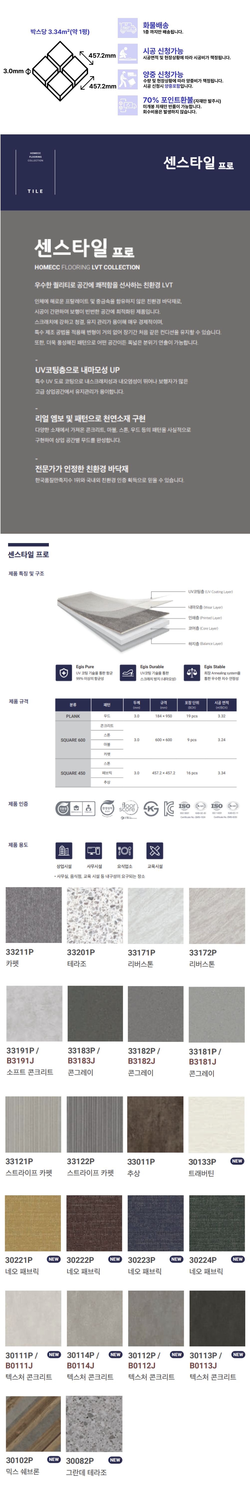 KCC 데코타일 센스타일프로라인, 라이트그레이 33191P 입니다. 판매 가격 단위는 박스이며, 3.0(T)*457.2(W)*457.2(L) (박스당 3.34㎡)입니다. 일반 소비자가 기준 41250원에 판매하고 있으며, 사업자 단가는 앱 설치 및 로그인 시 확인 가능합니다.