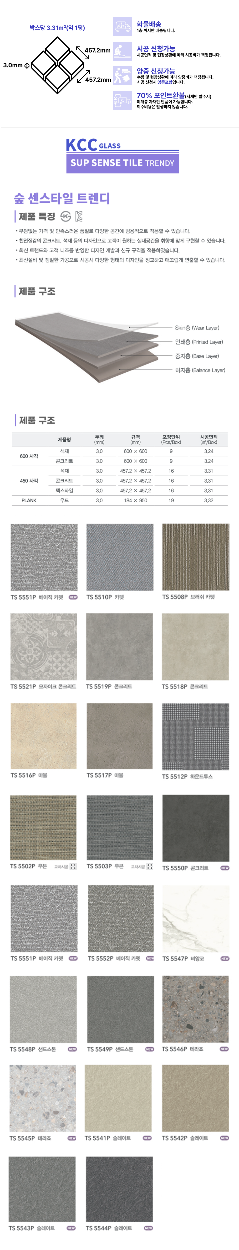 KCC 데코타일 숲센스타일트랜디라인, 베이지 TS5541P 입니다. 판매 가격 단위는 박스이며, 3.0(T)*457.2(W)*457.2(L) (박스당 3.31㎡)입니다. 일반 소비자가 기준 28930원에 판매하고 있으며, 사업자 단가는 앱 설치 및 로그인 시 확인 가능합니다.
