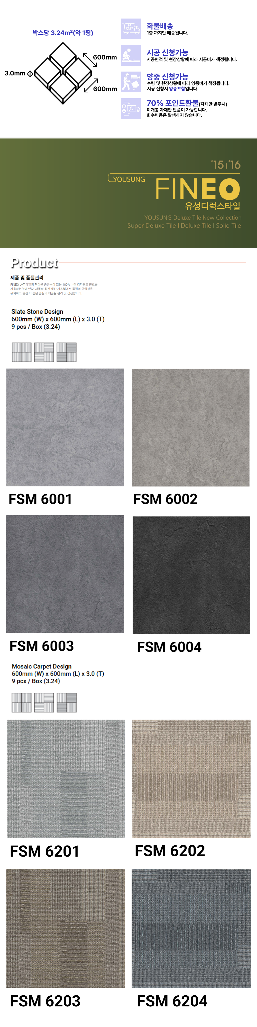 유성 데코타일 모던라인, 카펫 FSM6201 입니다. 판매 가격 단위는 박스이며, 3.0(T)*600(W)*600(L) (박스당 3.24㎡)입니다. 일반 소비자가 기준 27500원에 판매하고 있으며, 사업자 단가는 앱 설치 및 로그인 시 확인 가능합니다.