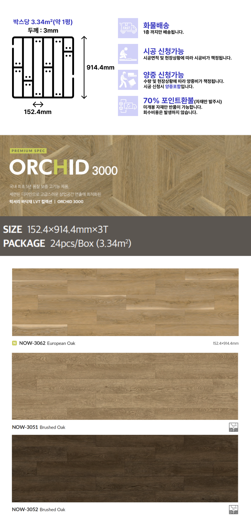 녹수 데코타일 오키드3000라인, EuropeanOak NOW-3062 입니다. 판매 가격 단위는 박스이며, 3.0(T)*152.4(W)*914.4(L) (박스당 3.34㎡)입니다. 일반 소비자가 기준 41580원에 판매하고 있으며, 사업자 단가는 앱 설치 및 로그인 시 확인 가능합니다.