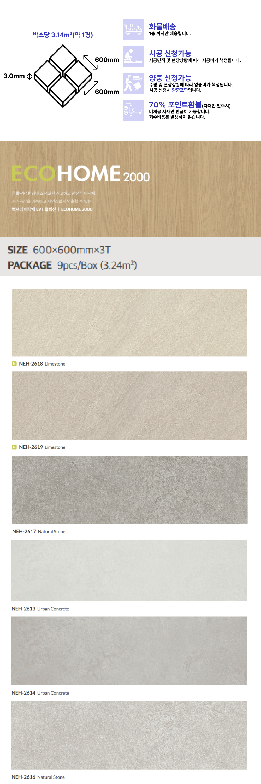녹수 데코타일 에코홈2000라인, Limestone NEH-2618 입니다. 판매 가격 단위는 박스이며, 3.0(T)*600(W)*600(L) (박스당 3.24㎡)입니다. 일반 소비자가 기준 41580원에 판매하고 있으며, 사업자 단가는 앱 설치 및 로그인 시 확인 가능합니다.