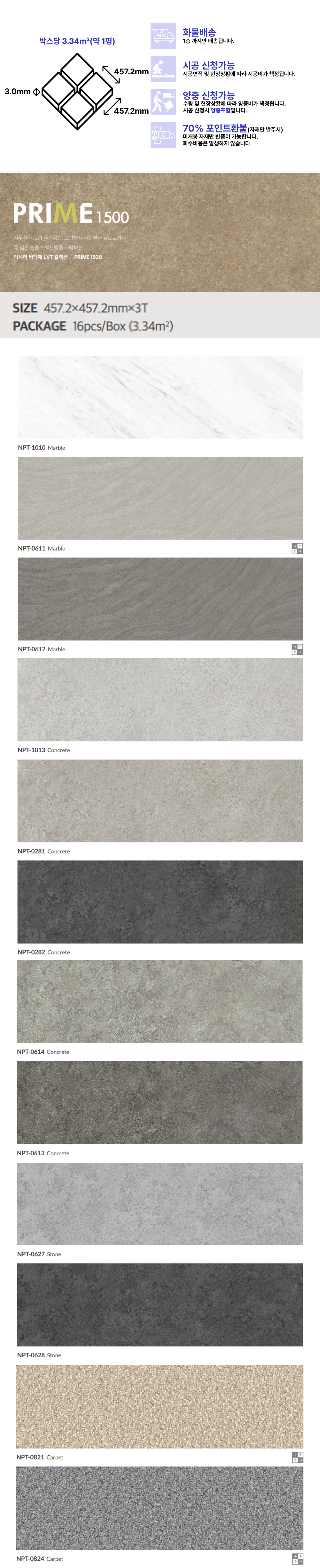 녹수 데코타일 프라임1500라인, Marble NPT-0612 입니다. 판매 가격 단위는 박스이며, 3.0(T)*457.2(W)*457.2(L) (박스당 3.34㎡)입니다. 일반 소비자가 기준 31240원에 판매하고 있으며, 사업자 단가는 앱 설치 및 로그인 시 확인 가능합니다.