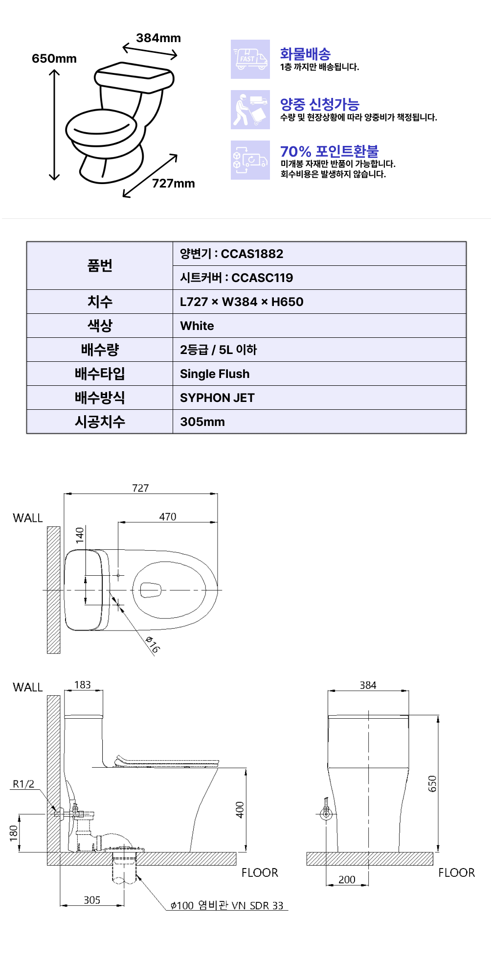 아메리칸스탠다드 브랜드의 원피스양변기 시그니처 원피스양변기 입니다. 사이즈는 727(L)*382(W)*650(H)입니다. 일반 소비자가 기준 565400원에 판매하고 있으며, 사업자 단가는 앱 설치 및 로그인 시 확인 가능합니다.