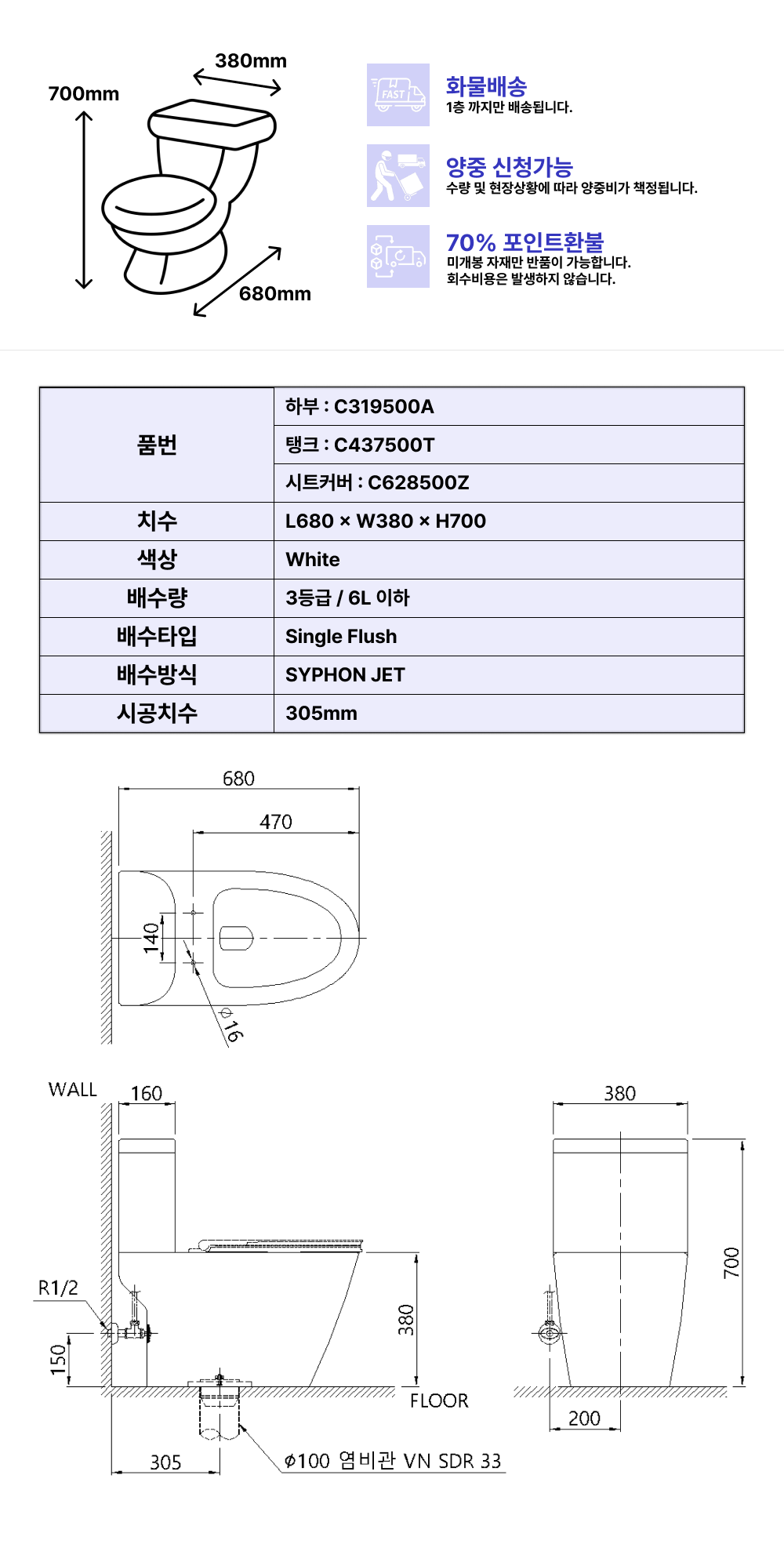 아메리칸스탠다드 브랜드의 투피스양변기 웨이브S 투피스양변기 입니다. 사이즈는 680(L)*380(W)*700(H)입니다. 일반 소비자가 기준 272800원에 판매하고 있으며, 사업자 단가는 앱 설치 및 로그인 시 확인 가능합니다.
