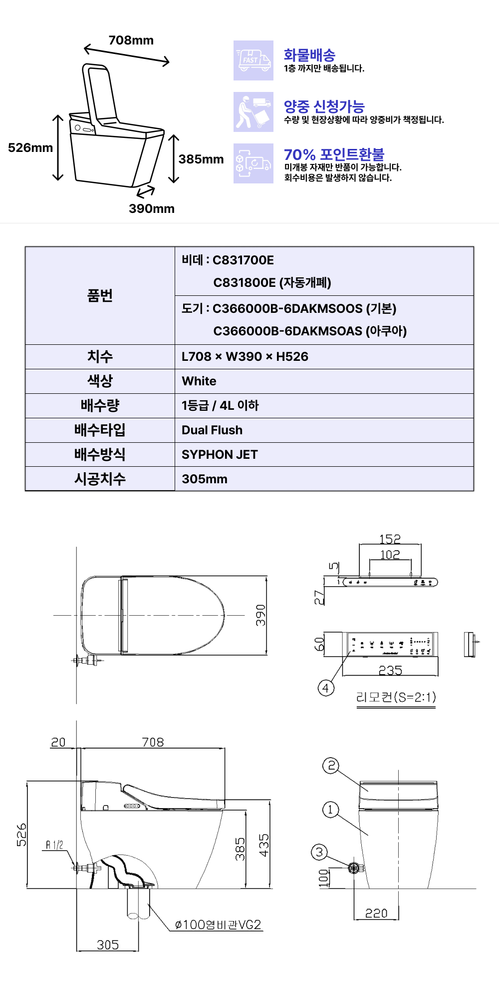 아메리칸스탠다드 브랜드의 탱크리스양변기 플랫 라운드 비데일체형양변기(직수형) 입니다. 사이즈는 708(L)*390(W)*526(H)입니다. 일반 소비자가 기준 887800원에 판매하고 있으며, 사업자 단가는 앱 설치 및 로그인 시 확인 가능합니다.