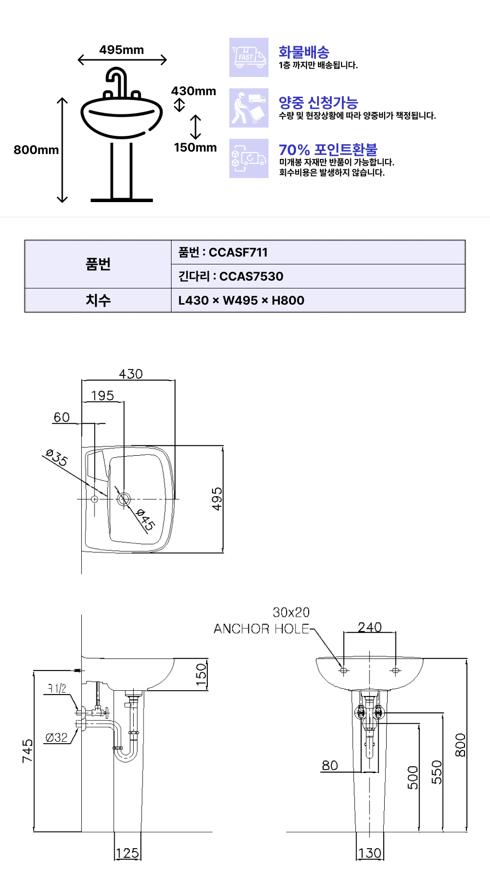 아메리칸스탠다드 브랜드의 벽붙임세면대 뉴코디 긴다리세면기 입니다. 사이즈는 430(L)*495(W)*800(H)입니다. 일반 소비자가 기준 106480원에 판매하고 있으며, 사업자 단가는 앱 설치 및 로그인 시 확인 가능합니다.
