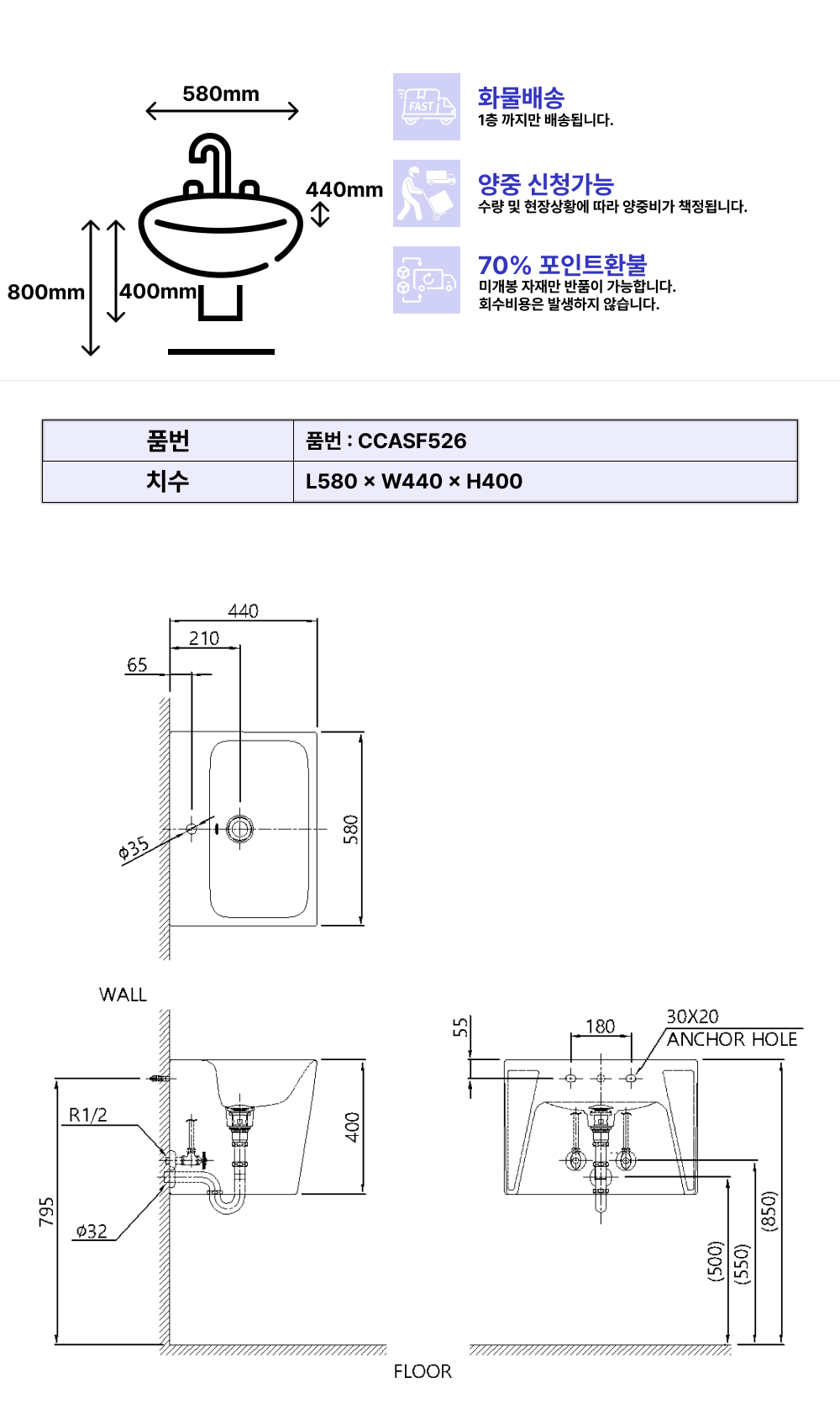 아메리칸스탠다드 브랜드의 벽붙임세면대 코너스톤 일체형세면기 입니다. 사이즈는 440(L)*580(W)*400(H)입니다. 일반 소비자가 기준 235400원에 판매하고 있으며, 사업자 단가는 앱 설치 및 로그인 시 확인 가능합니다.