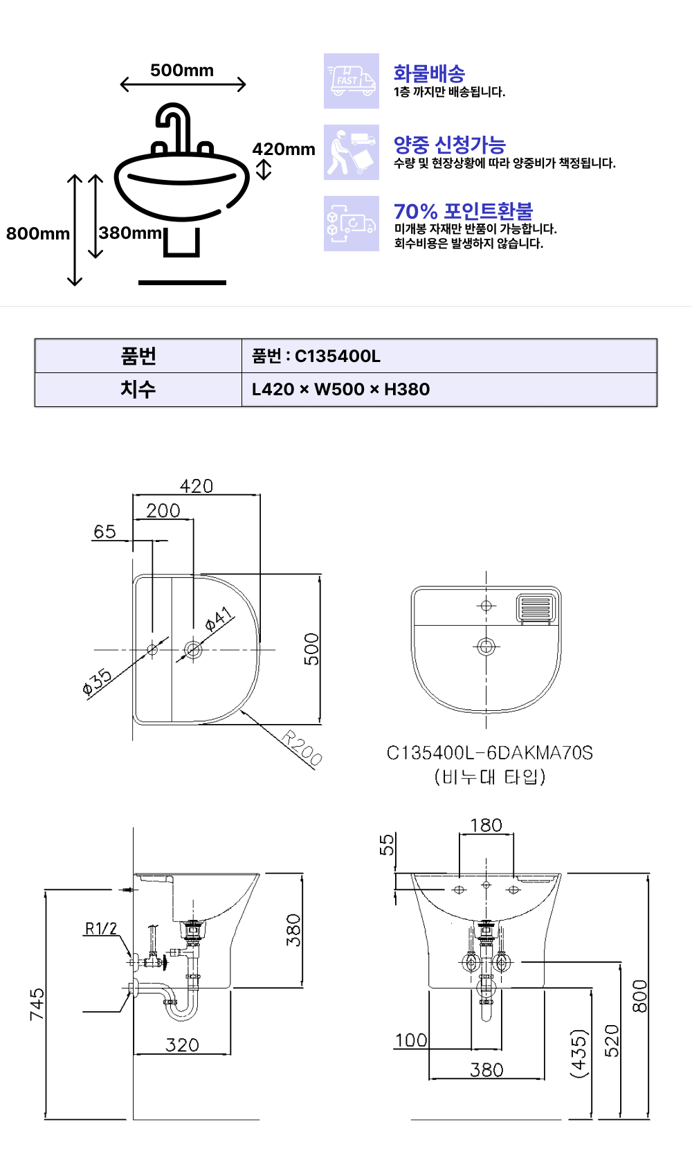 아메리칸스탠다드 브랜드의 벽붙임세면대 플랫 내추럴R 일체형세면기(비누대) 입니다. 사이즈는 420(L)*500(W)*380(H)입니다. 일반 소비자가 기준 166100원에 판매하고 있으며, 사업자 단가는 앱 설치 및 로그인 시 확인 가능합니다.