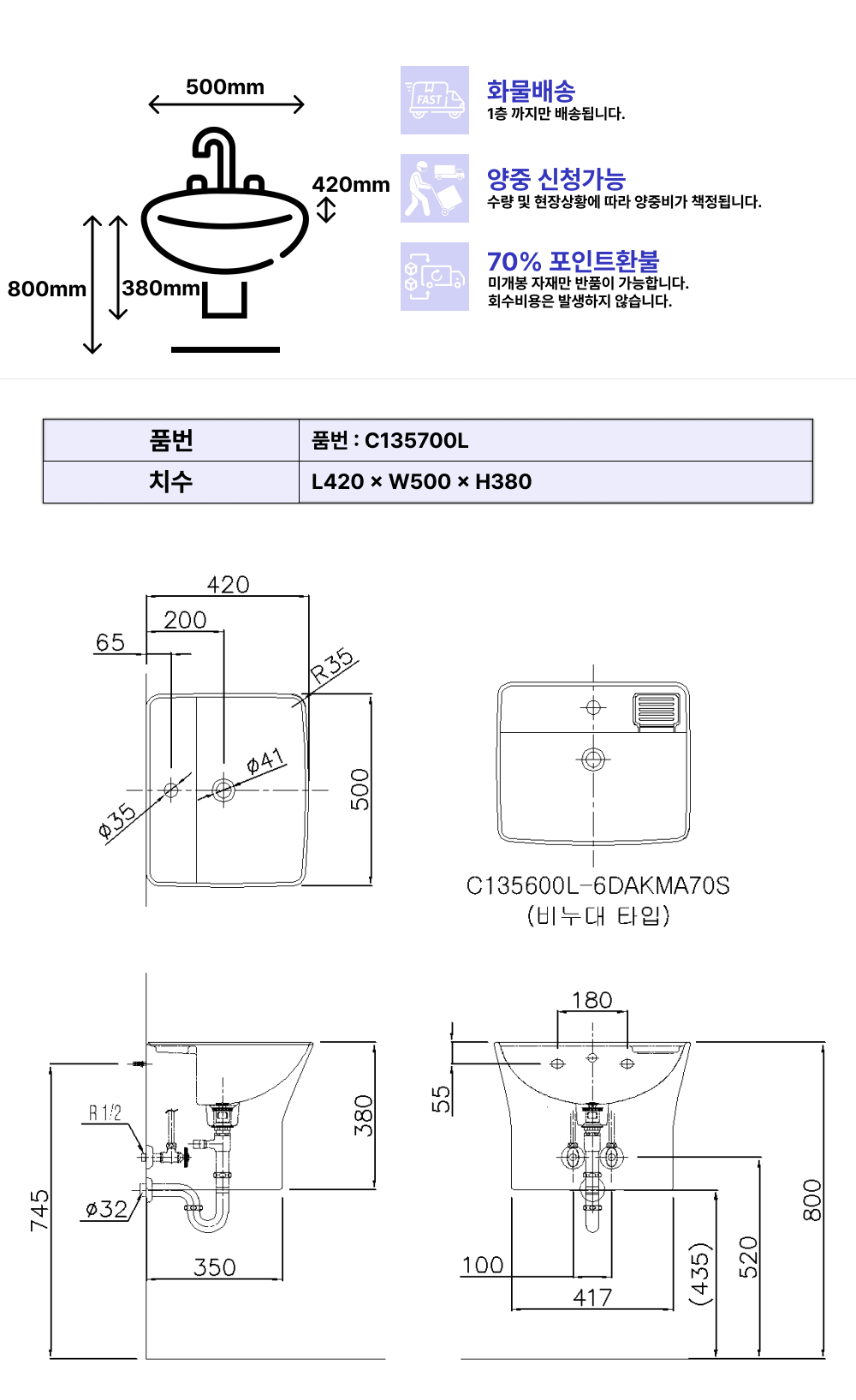 아메리칸스탠다드 브랜드의 벽붙임세면대 플랫 내추럴S 일체형세면기 입니다. 사이즈는 420(L)*500(W)*380(H)입니다. 일반 소비자가 기준 160600원에 판매하고 있으며, 사업자 단가는 앱 설치 및 로그인 시 확인 가능합니다.