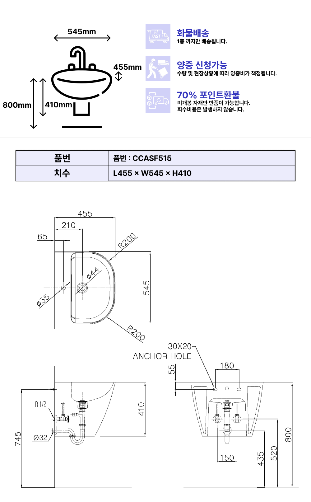 아메리칸스탠다드 브랜드의 벽붙임세면대 플랫 라운드 일체형세면기 입니다. 사이즈는 455(L)*545(W)*410(H)입니다. 일반 소비자가 기준 212300원에 판매하고 있으며, 사업자 단가는 앱 설치 및 로그인 시 확인 가능합니다.