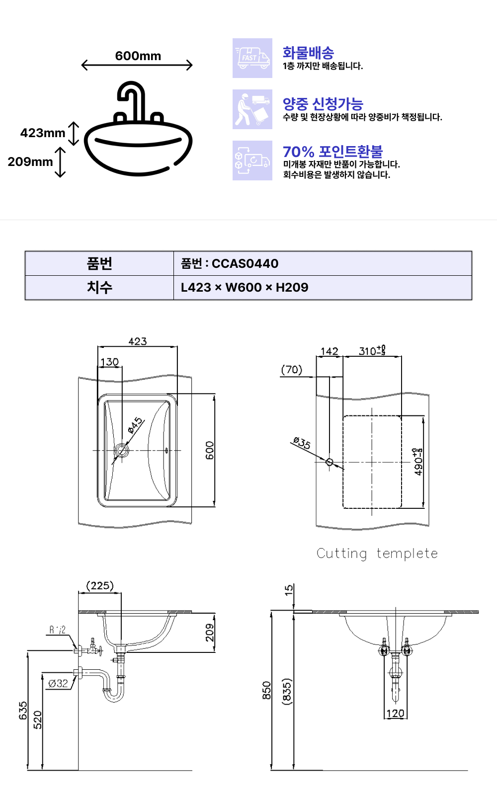 아메리칸스탠다드 브랜드의 매립세면대 액티바 언더카운터세면기 입니다. 사이즈는 423(L)*600(W)*209(H)입니다. 일반 소비자가 기준 98010원에 판매하고 있으며, 사업자 단가는 앱 설치 및 로그인 시 확인 가능합니다.