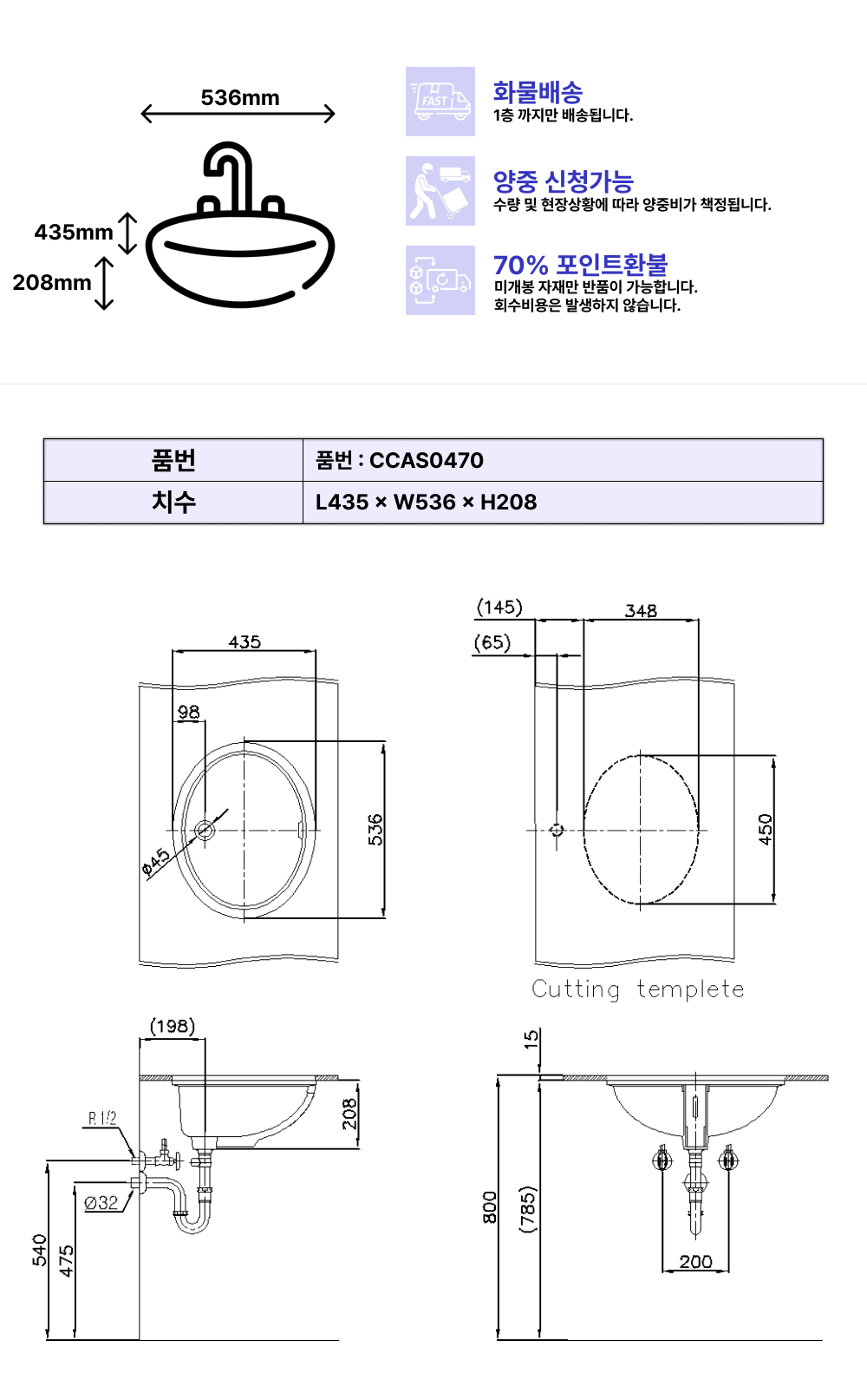 아메리칸스탠다드 브랜드의 매립세면대 오발린 언더카운터세면기 입니다. 사이즈는 435(L)*536(W)*208(H)입니다. 일반 소비자가 기준 75680원에 판매하고 있으며, 사업자 단가는 앱 설치 및 로그인 시 확인 가능합니다.