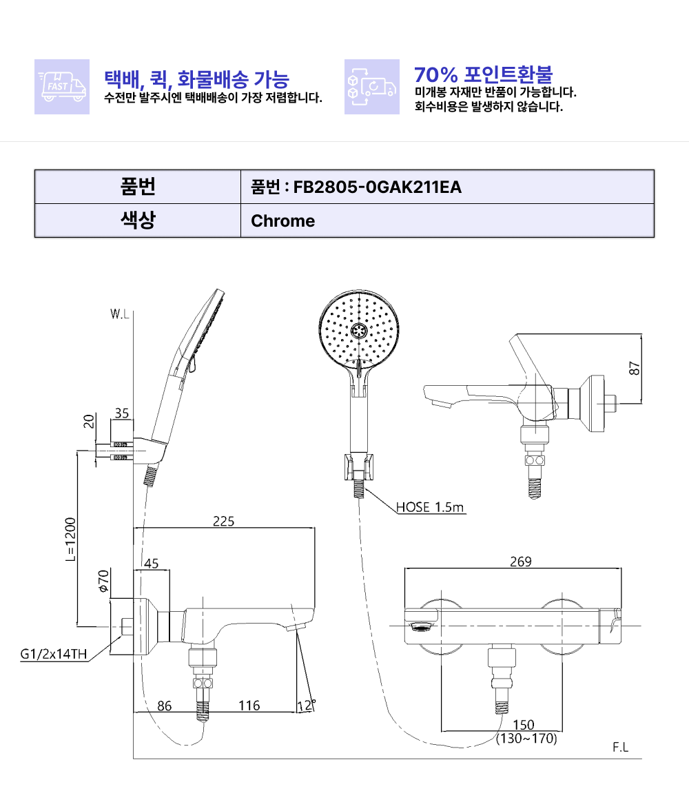 아메리칸스탠다드 브랜드의 샤워/욕조수전 라모다 샤워욕조수전 입니다. 일반 소비자가 기준 260700원에 판매하고 있으며, 사업자 단가는 앱 설치 및 로그인 시 확인 가능합니다.