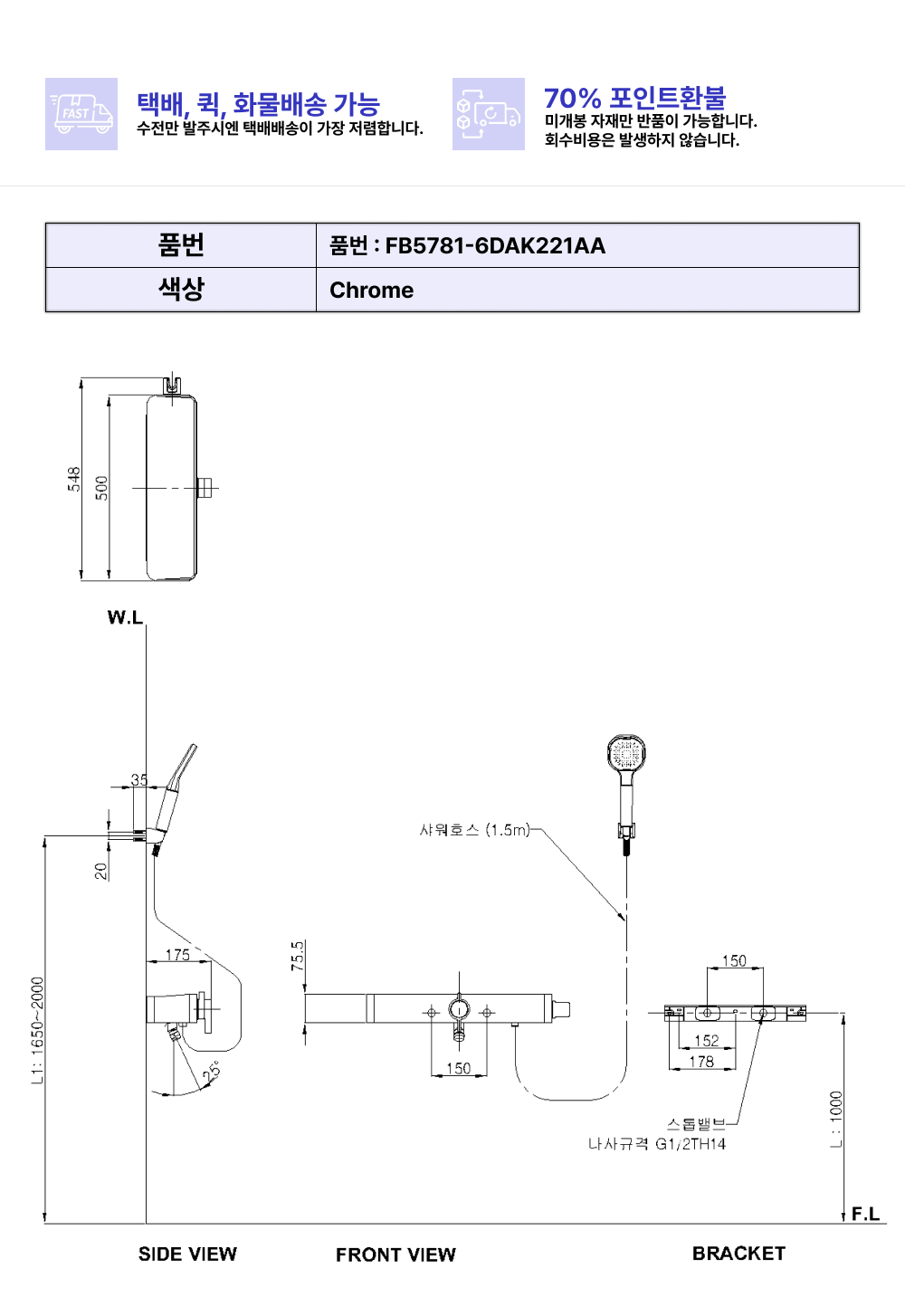 아메리칸스탠다드 브랜드의 샤워/욕조수전 플랫 2WAY샤워욕조수전(선반형) 입니다. 일반 소비자가 기준 184800원에 판매하고 있으며, 사업자 단가는 앱 설치 및 로그인 시 확인 가능합니다.